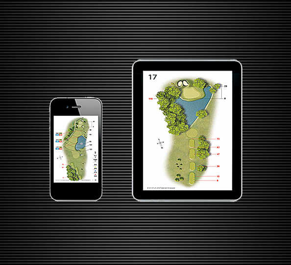 Einfach zu lesende Grafik, die von Strokesaver genauen Punkt zu Punkt Distanzen vom Tee - zum Grün mit den Spieltipps jederzeit zur Hand, Vermarktungsmöglichkeiten und natürlich zufriedene Golfer durch die kostenlose Abgabe der Guides an Greefee Spieler, Mitglieder und Gäste.